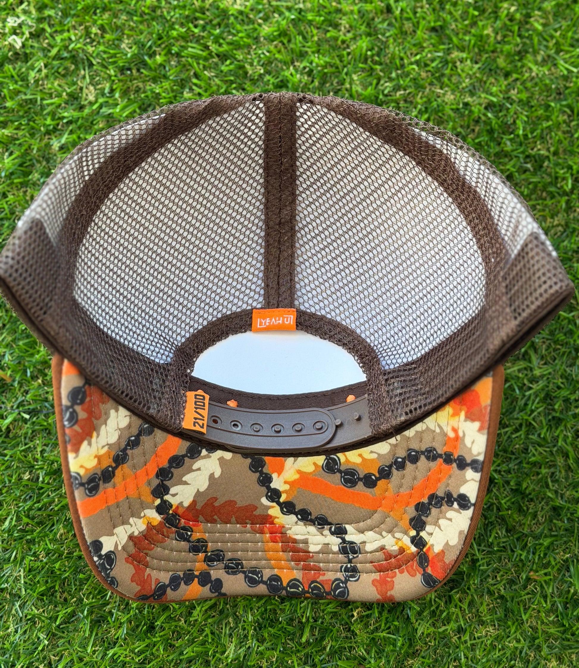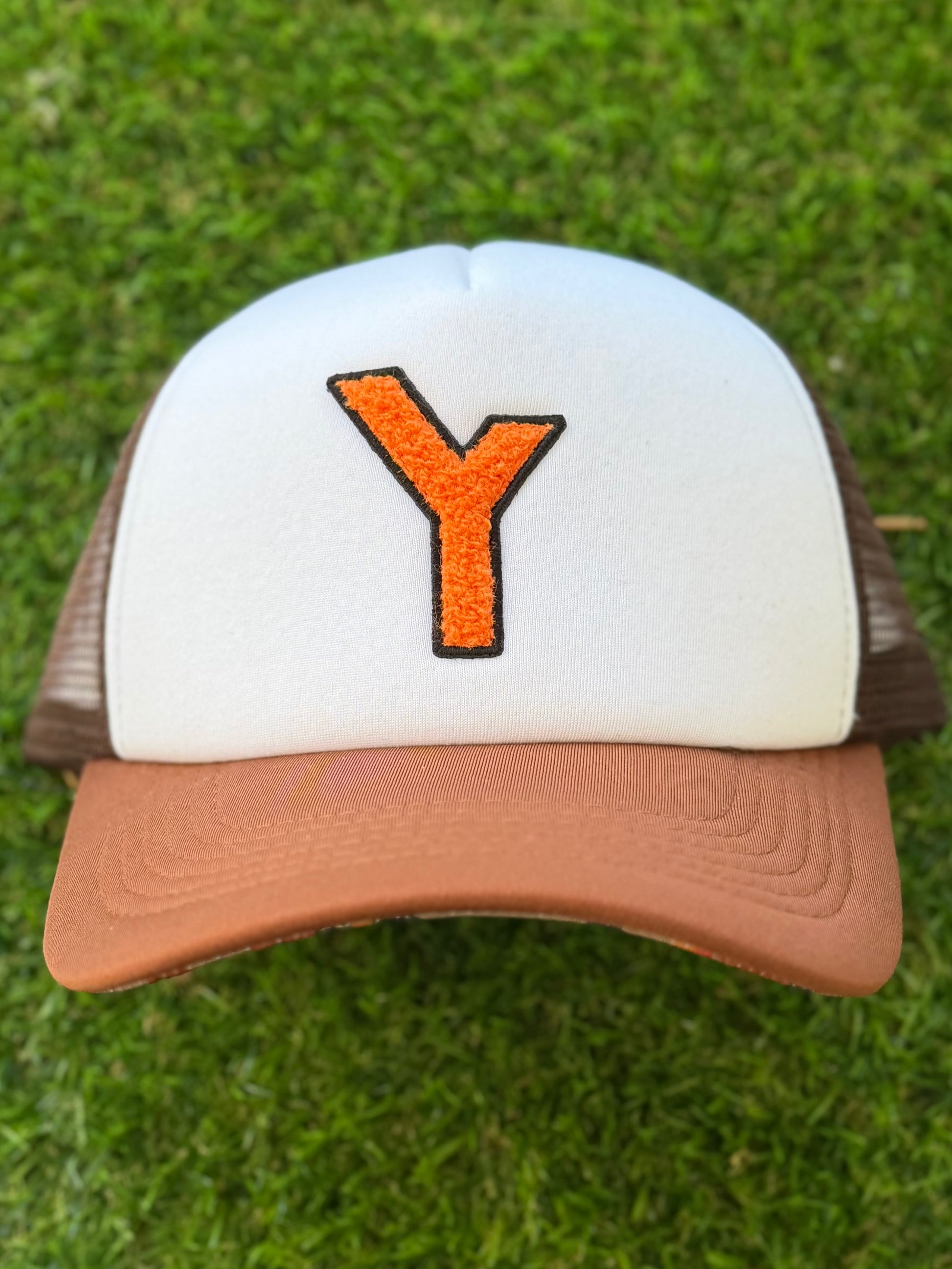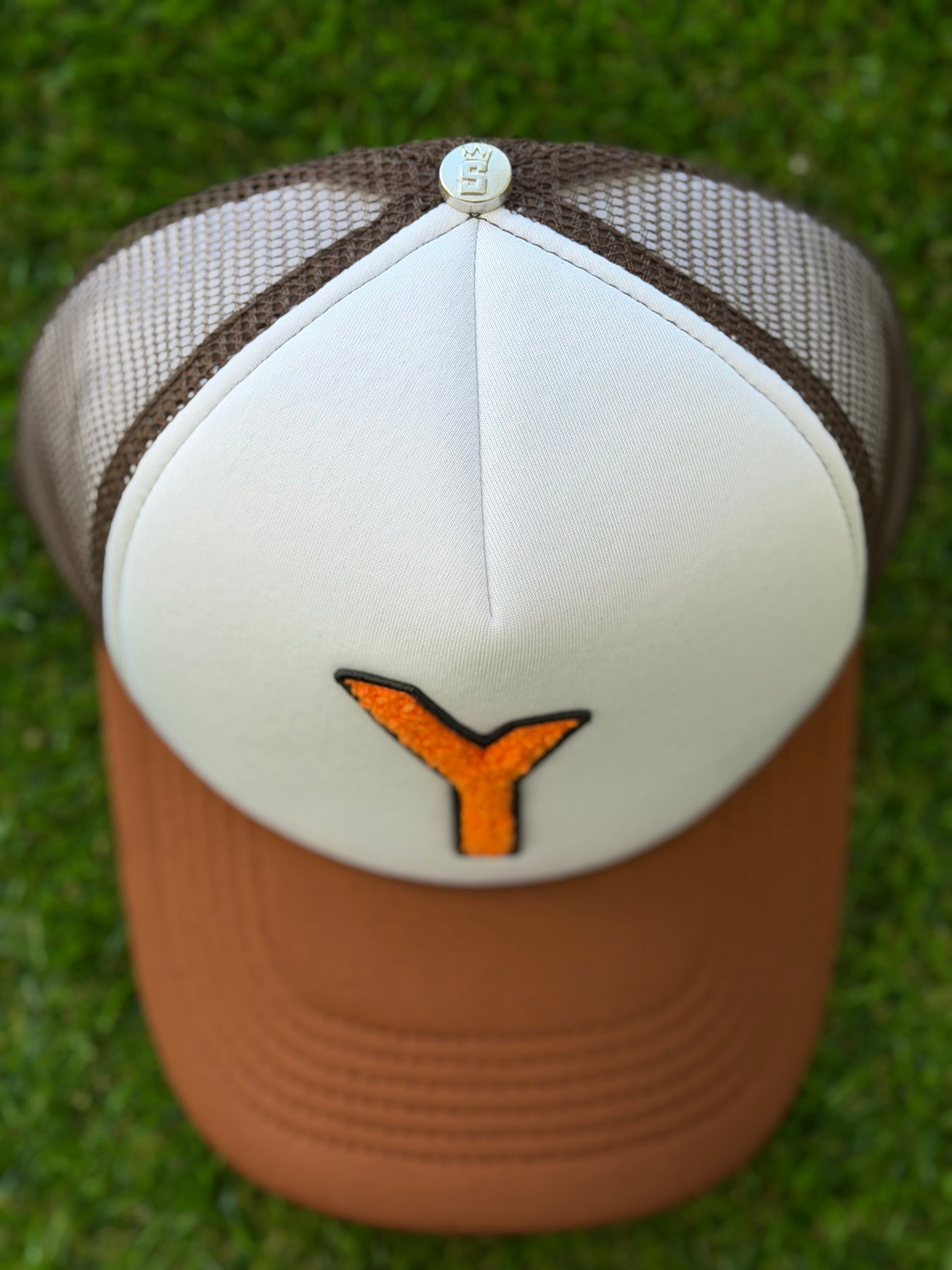 Up top, you get the bold towel-stitched Y in volcanic orange — a symbol of Your Why, Your roots, Your journey. The earthy brown and sand tones ground the hat in the land, while the custom underside tells the full story: